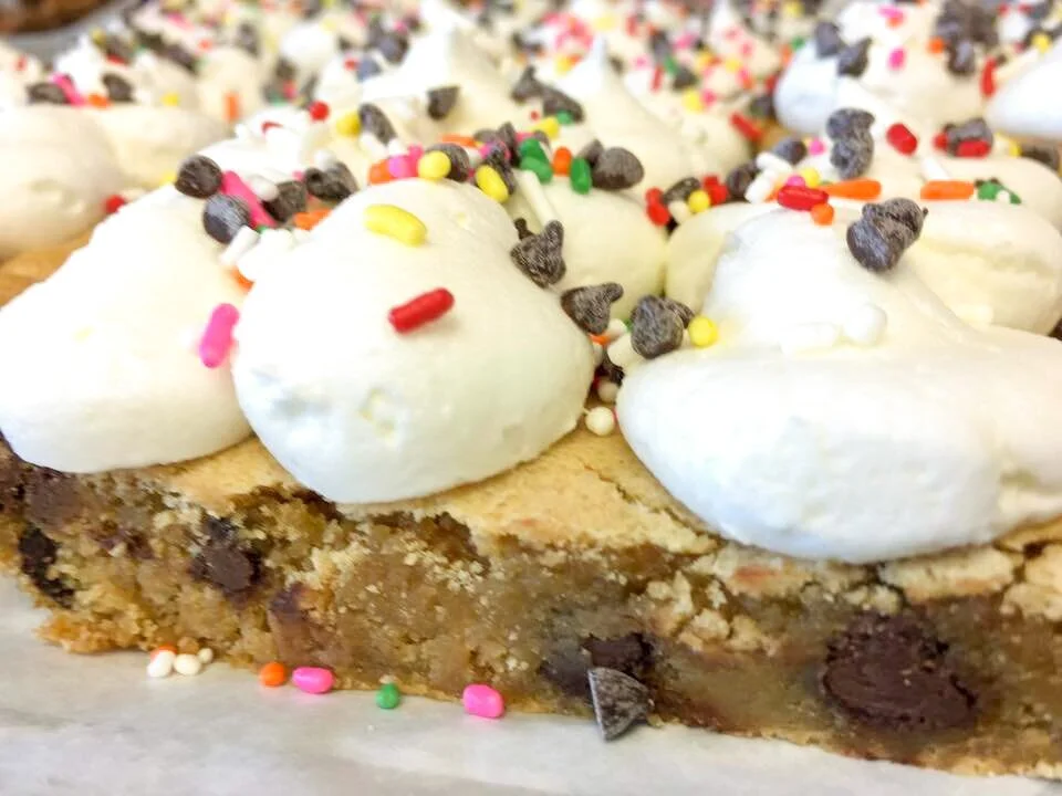 Weekly Menu › Cookie Bar Cookie Bar $5.00 Chocolate chip brownie style dessert bar topped with vanilla buttercream, mini chocolate chips and SPRINKLES!!! Chocolate chip brownie style dessert bar topped with vanilla buttercream, mini chocolate chips and SPRINKLES!!! Quantity: Add To Cart Added!